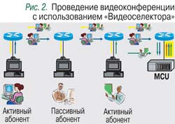 Поскольку, кроме Conference server, других решений ВКС, хоть как-то поддерживающих мультикаст, на рынке обнаружено не было, перед разработчиками встала необходимость создать программно-аппаратный комплекс, обеспечивающий возможность промышленного применения технологии. В процессе работы над этим решением, получившим название «Видеоселектор», удалось значительно повысить эффективность использования канальных ресурсов по сравнению с первоначальным вариантом. В основу было положено следующее соображение: при проведении видеоконференций с действительно большим (более 30) числом участников коллективная дискуссия просто невозможна как технологически (видеоизображение следует за звуком, и если все заговорят одновременно, оно «размоется» за счет постоянного переключения), так и психологически – люди просто перестают воспринимать друг друга. Поэтому обычно используется жесткий регламент, когда ведущий дает слово. В такой ситуации точно известно, чье изображение в каждый момент будет транслироваться всем. Так зачем же передавать аудио/видеопотоки в центр на MCU со всех точек, когда интерес в настоящий момент представляет информация только с одной-двух из них? Так появилась идея разделения участников на пассивных (не имеющих в данный момент возможности передавать аудио/видеопотоки на MCU) и активных, чье изображение и голос передаются на МCU и могут транслироваться всем участникам конференции. Перевод участников из активных в пассивные осуществляет оператор по команде ведущего конференции.