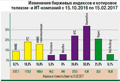 Среди бумаг ИТ-компаний наибольший рост показали акции «Яндекса». В США на бирже NASDAQ котировки компании выросли на 21,3%. Компания представила достаточно сильную отчетность по итогам IV квартала 2016 г. Так, консолидированная выручка за квартал выросла на 22% г/г – до 22,1 млрд руб. Скорректированный показатель EBITDA увеличился по сравнению с аналогичным показателем за IV квартал 2015 г. на 2% – до 6,7 млрд руб. Скорректированная чистая прибыль составила 3,2 млрд руб., уменьшившись на 11% г/г.