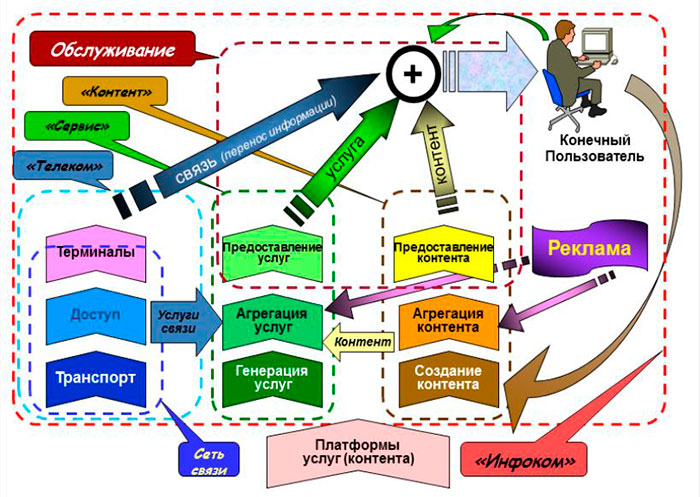 В этой связи хочется высказать некоторые соображения о том, как обеспечить возможность развития телекоммуникационных сетей в складывающихся условиях. В 2008 г. автор попытался изложить свое видение развития инфокоммуникационного рынка в материале, опубликованном на портале ИКС-медиа. За прошедшие годы по крайней мере один посыл того «трактата», как представляется, прошел проверку временем. Речь идет о том, что на телекоммуникационном рынке присутствуют два существенно различных и во многом автономных типа бизнеса – инфраструктурный, связанный с самими процессом передачи информации «из пункта А в пункт Б», и сервисный, обеспечивающий пользователей разнообразными услугами, которые базируются на использовании сетей связи. Квинтэссенция рассуждений на эту тему содержится в рисунке, который показывает сеть создания ценности инфокоммуникаций и который хочется напомнить читателям.