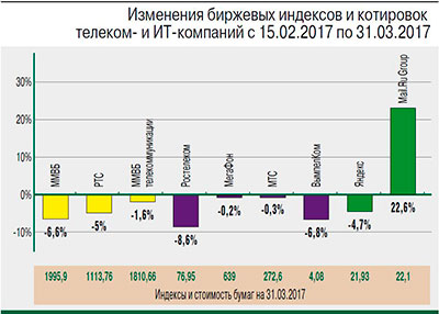 Среди ИТ-компаний в лидерах роста на этот раз оказались бумаги Mail.Ru Group, взлетевшие на 22,6% г/г. Судя по всему, важным фактором роста стала сильная отчетность компании за IV квартал 2016 г. Так, совокупная выручка за период увеличилась на 19% г/г, до 13 млрд руб., при этом выручка от рекламы прибавила 26,3%, до 5,9 млрд руб. Выручка подразделения онлайн-игр выросла на 36,5% г/г, до 3,8 млрд руб. Поступления от платежей пользователей снизились на 8,7% г/г, до 3,05 млрд руб. Помимо восстановления рекламного рынка в России драйвером роста Mail.Ru Group остается высокая активность M&A. Наконец, по всей видимости, позитивное влияние на рыночную капитализацию компании оказало приобретение ее контрольного пакета «МегаФоном» (63,8% голосующей доли и 15,2% экономического интереса). Несмотря на отсутствие обязательного предложения о выкупе миноритариям, контроль со стороны «МегаФона» в числе прочего может способствовать улучшению рыночной позиции Mail.Ru Group за счет более эффективной продажи таргетированной рекламы и реализации MNVO-проектов.