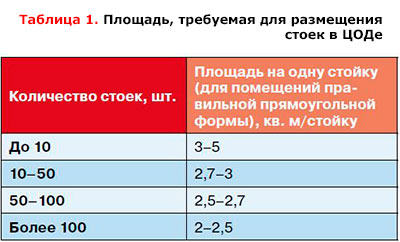 Есть более простой способ оценки вместимости ЦОДа. Он основан на статистических данных, полученных из реализованных проектов (табл. 1), и хотя он менее точен, чем произведенный нами расчет, но его погрешность вполне допустима для приблизительной оценки.