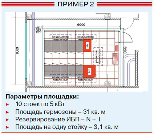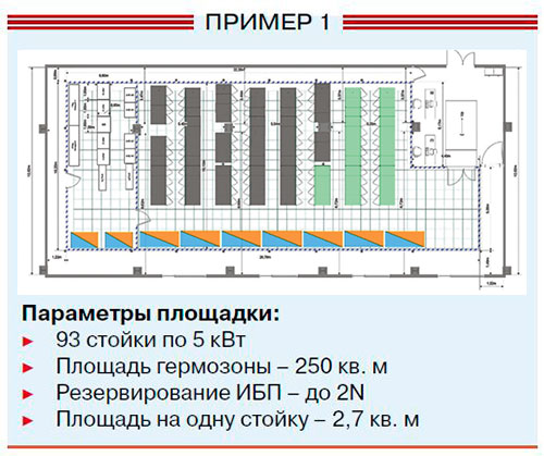 Построенные дата-центры (примеры 1–3) подтверждают статистические данные табл. 1. Однако не следует полагаться на приведенные цифры безоглядно, поскольку геометрия машинного зала – не единственный фактор, определяющий емкость ЦОДа. Нужное место в дата-центре занимает еще целый ряд объектов:
