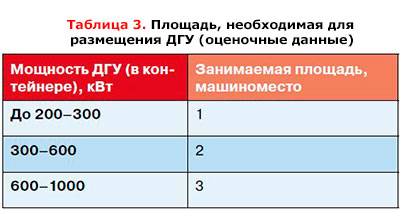 Площадь, необходимая для размещения ДГУ на прилежащей к ЦОДу территории, зависит от ее мощности (табл. 3).