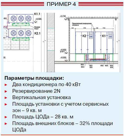 Исходя из опыта реализованных проектов (см. примеры 4 и 5), можно принять, что для размещения внешних блоков фреоновых кондиционеров требуется 30–35% площади машинных залов ЦОДа.