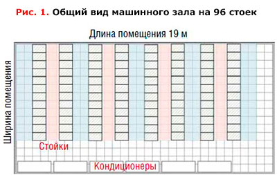 Рассмотрим планировку типового ЦОДа на 96 стоек размером 600×1000 мм (рис. 1). Помещения для ИБП и АКБ на данном этапе не учитываем.