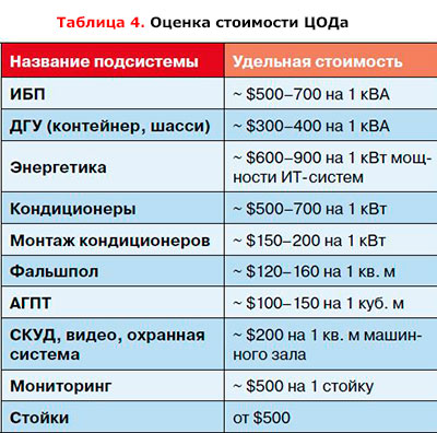 В табл. 4 приведена удельная стоимость отдельных подсистем ЦОДа, реализованного с применением наиболее популярных технических решений.