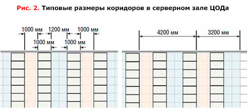 Безусловно, при выборе ширины коридоров между рядами стоек возможна масса вариаций. Можно уменьшить горячий коридор до 800 мм и даже до 600 мм, используя двойные распашные двери и забывая об удобстве обслуживания. Можно устанавливать стойки не по линии стыка двух рядов плит фальшпола. Но все эти варианты стоит рассматривать лишь в ходе детального проектирования, при нехватке пространства для размещения оборудования.