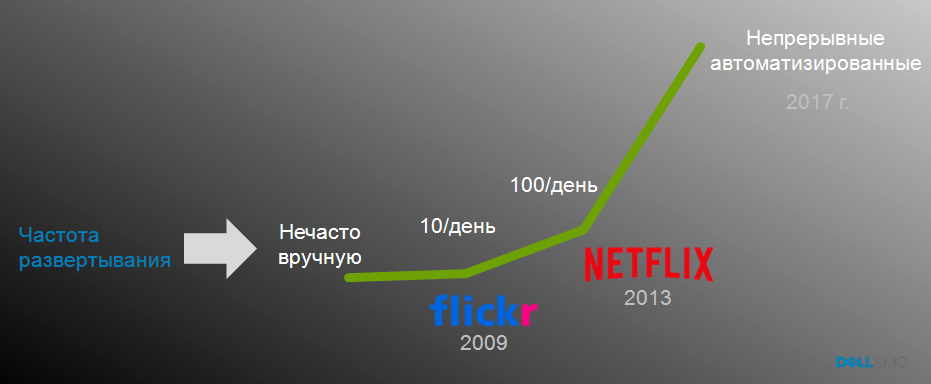 При этом возрастает скорость изменений, которые происходят в бизнесе компании, в ее продуктах и сервисах в условиях цифровой трансформации, а, следовательно, требуется чуть ли не ежедневное обновление с их учетом ключевых приложений. Поскольку этого невозможно добиться при классическом подходе к разработке ПО, на повестку дня сегодня выходит применение гибкой методологии разработки и набор практик DevOps, описывающий технологический подход к организации инфраструктуры для ее реализации, констатировал Андрей Николаев, специалист по облачным платформам компании Dell EMC.