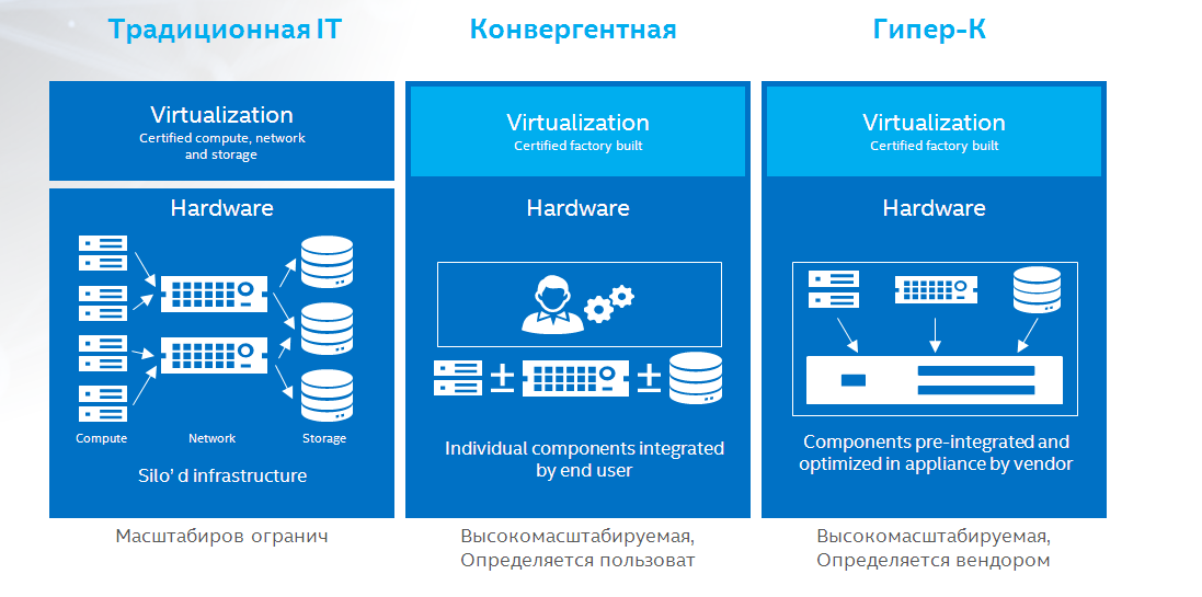 Рис. 3. Три основных варианта построения инфраструктуры SDI (Источник: из презентации Intel на конференции Cloud & Digital Transformation 2018)