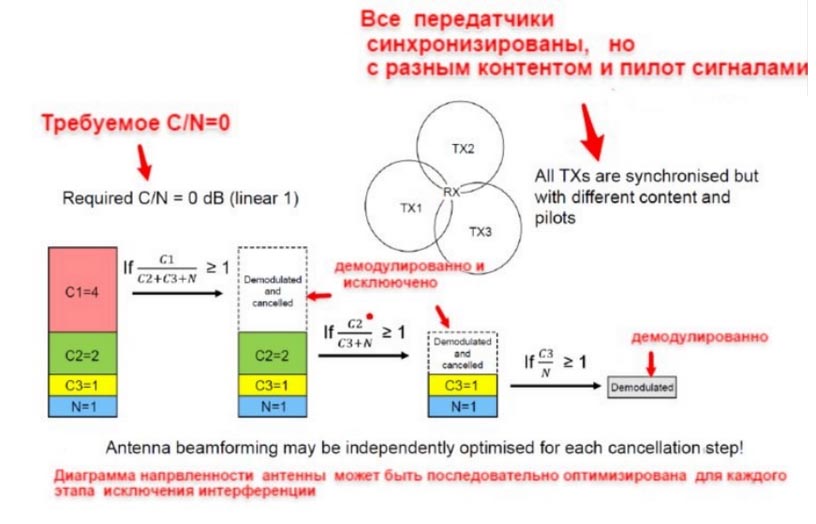 В приведенном примере в точке Rx требуется принять сигнал С3 от передатчика Tx3, который оказывается слабее двух других, присутствующих в этой точке. Если для С1 — самого мощного из трех сигналов — справедливо неравенство С1 ≥ С2 + С3 + N, то при использовании достаточно помехоустойчивого режима сигнал может быть демодулирован и восстановлен. Затем сигнал, принятый от передатчика Т1, можно опять промодулировать и вычесть из суммарного сигнала, поступившего на вход тюнера. Выполнение упомянутого неравенства можно обеспечить при использовании фазированных антенных решеток. На следующем этапе таким же образом вычитается сигнал С2. Опять же это возможно при выполнении неравенства С2 ≥ С3 +N. И наконец, если С3 ≥ N, можно будет демодулировать и требуемый сигнал.