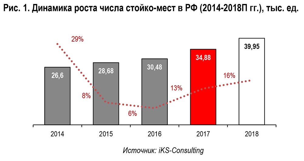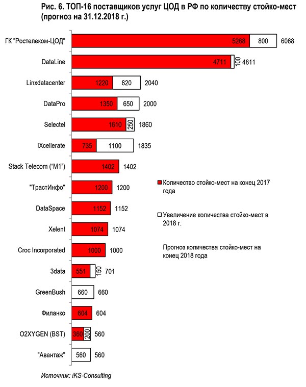 По данным опубликованного iKS-Consulting отчета «Российский рынок коммерческих дата-центров 2017–2022», в течение 2017 года число стойко-мест, подлежащих коммерческой эксплуатации в России, возросло на 13% – до 34,88 тыс. единиц. При этом темпы наращивания емкости анализируемого рынка вышли на докризисный уровень, но остались вдвое меньше показателя 2014 года, когда после завершения целого ряда ранее приостановленных проектов темп ввода новых стоек достиг 29%. До конца 2018 года ожидается рост числа коммерческих стоек до 39,95 тыс. единиц (+16%). Основной вклад в этот рост в 2018 году внесли компании IXcellerate, «Ростелеком-ЦОД», GreenBush DC, DataPro и «Авантаж» – их доля в общем увеличении числа стоек превысила 73%.