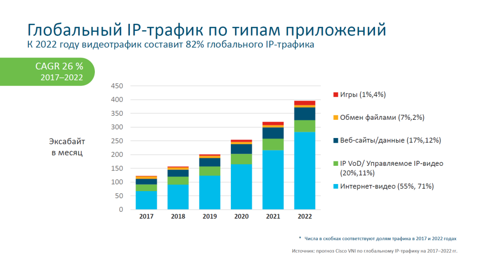 Что касается распределения IP-трафика по типам приложений, то здесь очевидный «король» – видео. В прошлом году на долю видеоприложений уже приходилось три четверти трафика, а к 2022 году этот показатель вырастет до 82%.