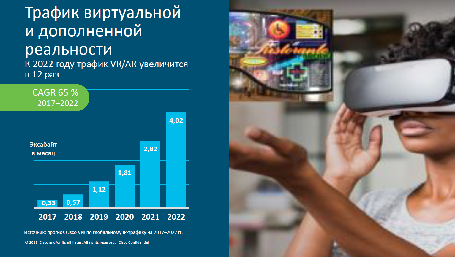 В новом исследовании VNI компания Cisco впервые выделила трафик приложений виртуальной (VR) и дополненной (AR) реальности. К 2022 году его объем увеличится в 12 раз и достигнет уровня 4 Эбайт, или порядка 1% общего объема IP-трафика. Рост генерируемого приложениями VR/AR-трафика на 65% в год говорит о том, что виртуальная и дополненная реальность из разряда модного тренда переходят в категорию эффективного инструмента, активно используемого бизнесом и промышленностью.