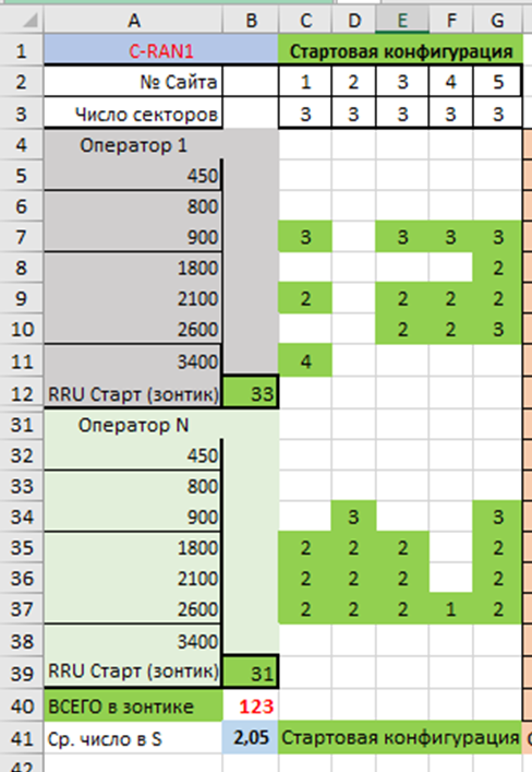 Общее число приемопередатчиков в данном случае равно 123 (стартовый зонтик), т.е. каждый оператор стартует (намерен стартовать), имея в каждом секторе в среднем z = 123/Sn = 2,05 TRX.