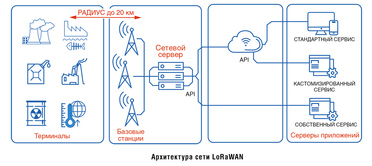 Сеть LoRaWAN состоит из абонентских терминалов, базовых станций (шлюзов), сетевого сервера и серверов приложений (рис. 2).