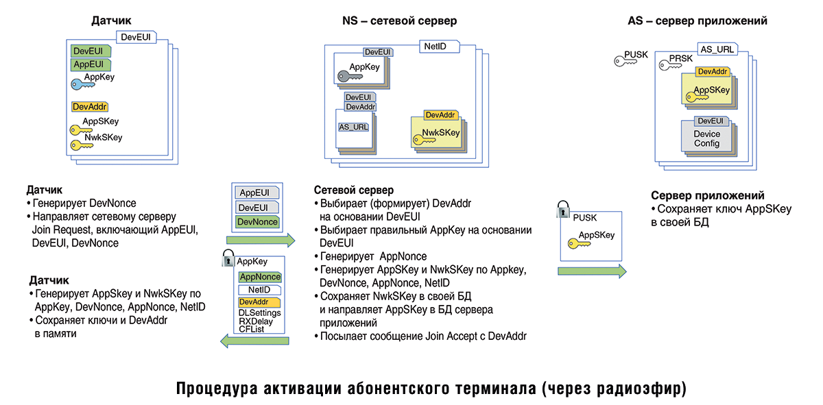 DevAddr, NwkSKey и AppSKey сохраняются в памяти абонентского устройства, DevAddr, NwkSKey – на сетевом сервере, а AppSKey – на сервере приложений.