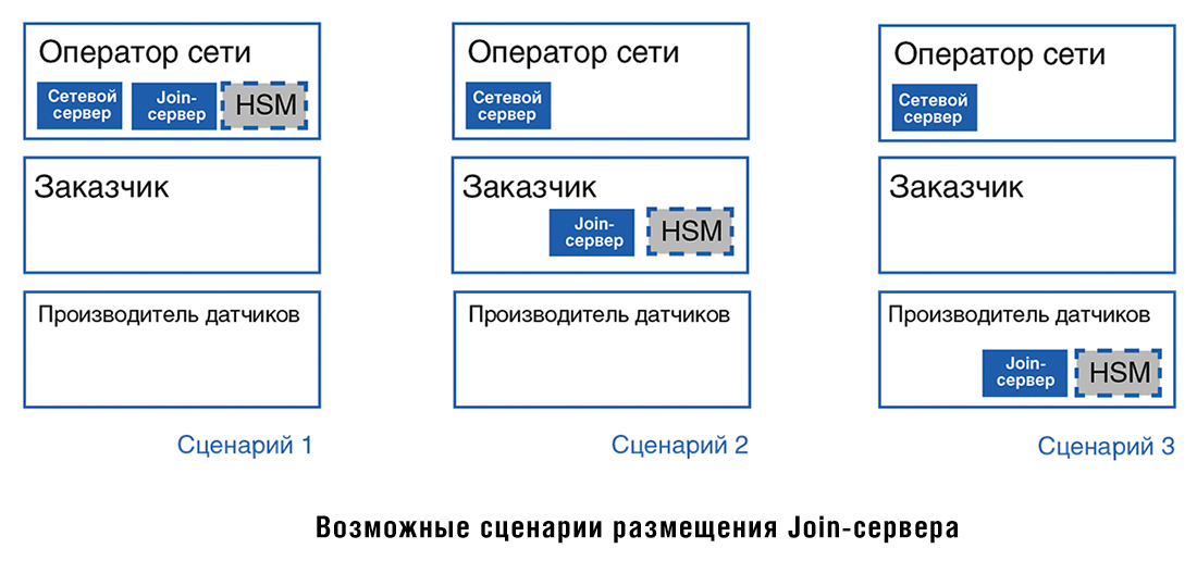 С целью дополнительной защиты процесса генерации сессионных ключей Join-сервер может быть размещен на территории клиента или производителя устройств (рис. 6). В этом случае даже сотрудники оператора не смогут получить доступ к сессионным и корневым ключам шифрования.