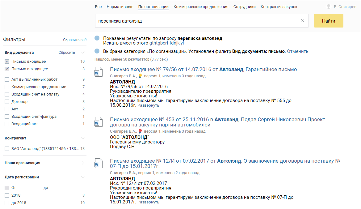 • исправление опечаток и неправильной раскладки клавиатуры при вводе запроса, подсказки по истории запросов и наименованиям общедоступных документов, работа с фильтрами;