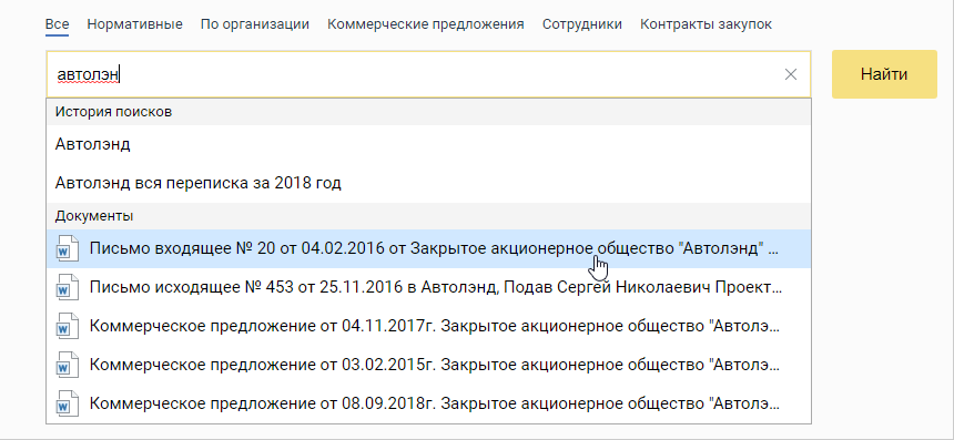 Во многих компаниях при подготовке к важным переговорам часто требуется быстро найти всю переписку с контрагентом за некоторый период. Ключевые слова здесь «всё» и «быстро», т.е. нужно обеспечить максимальную полноту поиска. Сеть компаний крупного контрагента может быть велика: 100 компаний в структуре – это даже не предел. Для заполнения критерия поиска по организации потребуется выбирать компании из большого списка, это неудобно и долго. Поиск переписки подразумевает выбор нескольких видов документов.