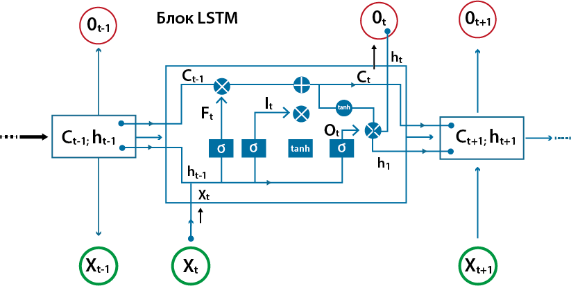 Взгляните на основной блок. Закрашенные прямоугольники представляют собой целые слои, символ внутри которых обозначает вид функции активации (выход). Кружки с символами «x» и «+» представляют операции умножения и сложения соответственно. Посмотрите на первую комбинацию (выход слоя с сигмоидой умножается на выход предыдущего члена). Если этот уровень дает нулевое значение, то умножение фактически обнуляет предыдущий член. Другими словами, эта первая комбинация – схема забывания.