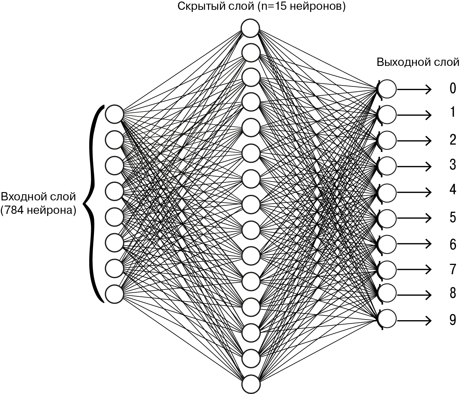 Слева – входы, на которые подаются отсканированные изображения рукописных цифр размером 28 x 28 пикселей. На рис. 2 показаны только восемь входов, но в действительности их 784 – по одному на каждый из 784 пикселей в изображениях. Справа – выходы. Чтобы результат был однозначным, при обработке каждого нового изображения должен срабатывать один и только один из нейронов. В середине – скрытый слой. Он назван так потому, что недоступен непосредственно. Такую нейронную сеть можно обучить распознавать отсканированные изображения рукописных цифр (как на рис. 3 для картинки 28 x 28 пикселей) с высокой точностью.