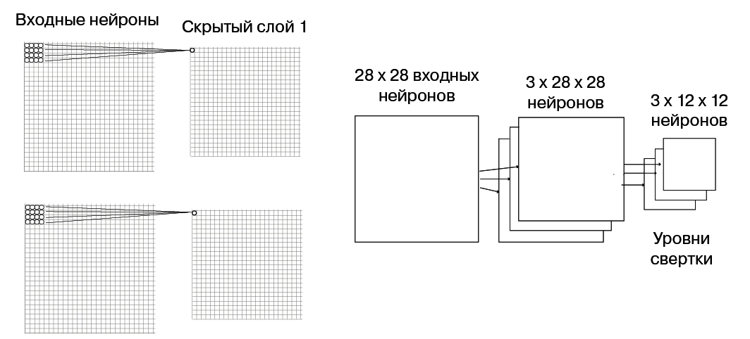 Представим, что мы снова работаем с изображениями размером 28 x 28 пикселей, но на этот раз мы не можем полагаться на то, что образ только один, и что он находится в центре. Рассмотрим логику первого скрытого слоя. Все нейроны теперь связаны не с одним пикселем, а с конкретными перекрывающимися областями входного изображения (в данном случае это область 5 x 5 пикселей).