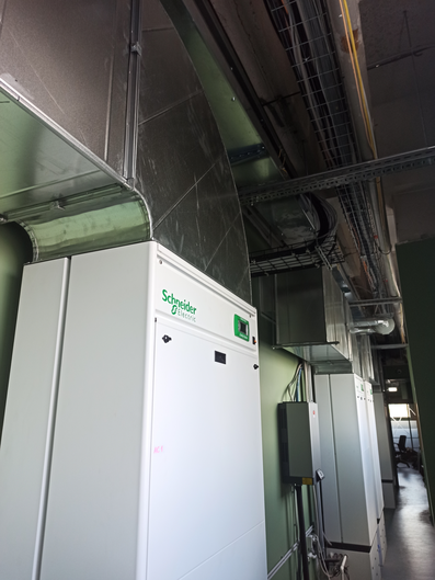 Для нашего ЦОДа мы выбрали систему охлаждения на уровне зала (четыре прецизионных кондиционера Schneider Electric) с подачей холодного воздуха в пространство фальшпола. В помещении поддерживается температура воздуха +22°С.
