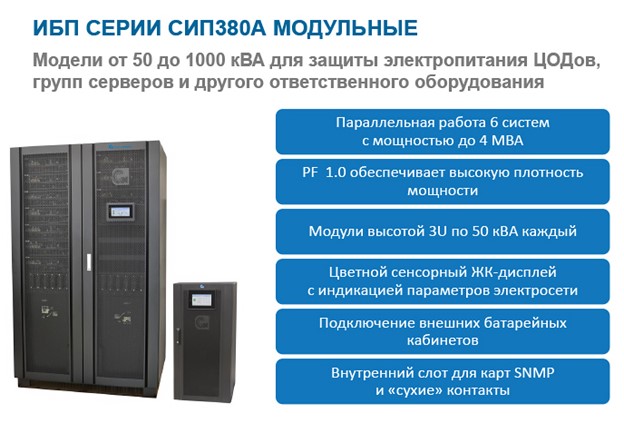 Компания постоянно обновляет продуктовую линейку. В этом году выпущены новые СИП380А МД – серия модульных напольных ИБП переменного тока 150–1000 кВА на силовых модулях мощностью 50 кВт с «горячей» заменой. Устройства построены на современных трехуровневых инверторах с высоким КПД. Снижение потерь при преобразовании обеспечило КПД системы до 96,5%, что уменьшает затраты на электроэнергию и отвод избыточного тепла. Современные схемотехнические решения в СИП380А увеличили коэффициент выходной мощности до 1.0, что позволяет подключать больше современного оборудования с высокой активной мощностью. Переход на модули 50 кВт в тех же габаритах, как и у существующих модулей 20 кВА, повысил плотность мощности ИБП, что оценят постоянно стремящиеся повысить отдачу от используемой площади создатели ЦОДов.