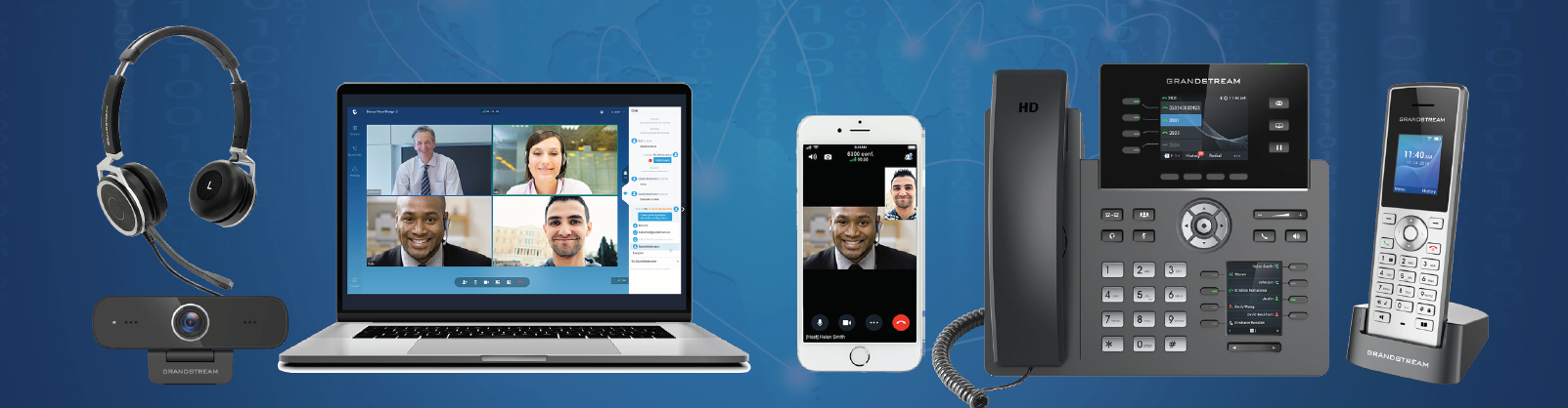 В числе инструментов бизнес-телефонии отметим HD-гарнитуры GUV3000 и GUV3005 с технологией шумоподавления для снижения фонового шума и HD-гарнитуру GUV3050 с поддержкой Bluetooth. Модель GUV3050 обеспечивает беспроводную передачу звука высокого качества, причем ее можно подключить к двум устройствам одновременно. Эта модель также оснащена микрофоном с функцией шумоподавления. GUV3050 совместима с любым Bluetooth-устройством, а также с любым устройством, которое имеет USB-разъем для подключения входящего в комплект поставки USB-донгла, в том числе с мобильными устройствами, ноутбуками и IP-телефонами Grandstream.