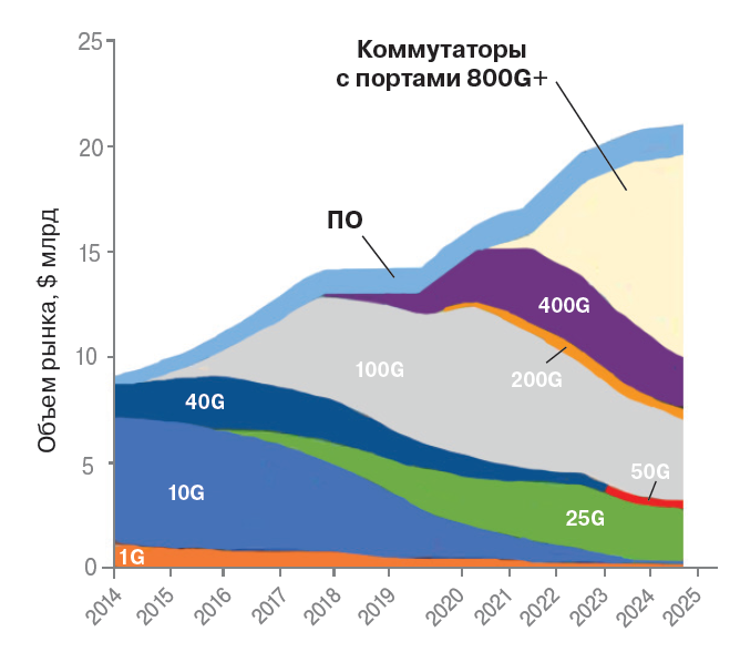 По мере того, как концепция сетей следующего поколения привлекает все больше внимания, отрасль должна решать конкретные проблемы внедрения. Мы неплохо представляем, как будет развиваться сетевая инфраструктура внутри ЦОДа: серверные соединения будут «разогнаны» до 50 Гбит/с и далее до 100 Гбит/с, пропускная способность коммутаторов вырастет до 25,6 Тбит/с, а переход на потоки 100 Гбит/с приведет нас к использованию подключаемых модулей 800G.
