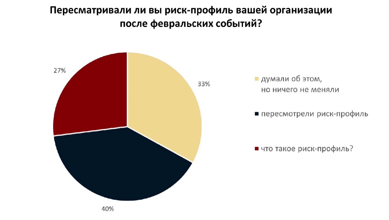 Изменилась ситуация, изменились и угрозы и вероятности их реализации. Компаниям необходимо обновить модель угроз и риск-профиль, и руководство должно быть готово принять новые риски или предпринять шаги по их нейтрализации. Однако даже среди участников конференции лишь 40% пересмотрели риск-профиль своей организации (рис. 1).