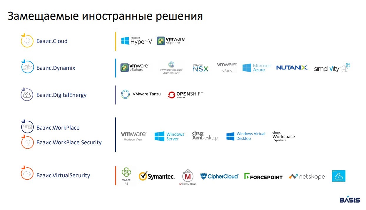 Так, используя «Базис.Cloud» – облачную платформу для виртуализации серверов и систем хранения данных – можно обойтись без Microsoft Hyper-V и VMware vSphere; динамическая инфраструктура для управления виртуальными машинами и контейнерами «Базис.Dynamix» освободит от необходимости применять соответствующие решения Nutanix, Microsoft Azure и VMware; cредство защиты информации систем виртуализации и облачных платформ «Базис.Virtual Security» может послужить заменой продуктов Symantec, CipherCloud, Forcepoint. Причем решения для обеспечения информационной безопасности сертифицированы ФСТЭК, что расширяет сферу их применения на российском рынке и является конкурентным преимуществом перед продуктами оставшихся в России зарубежных вендоров.
