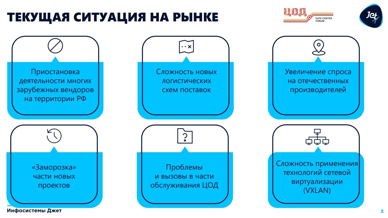 Проблемы «новой реальности» особенно сильно бьют по крупным корпоративным ЦОДам, усложняя техническое обслуживание продукции ушедших с рынка зарубежных вендоров. В частности, продукция Cisco и Huawei, как отметил директор центра сетевых решений компании «Инфосистемы Джет» Сергей Андронов, доступна теперь только по крайне ненадежной схеме параллельного импорта. Поэтому во многих корпоративных ЦОДах возникли серьезные трудности с реализацией современных технологий EVPN (Ethernet Virtual Privacy Network), виртуально расширяемых локальных сетей и мультисегментирования в сетях передачи данных.