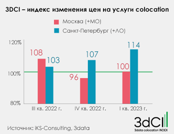 В 2022 г. iKS-Consulting в партнерстве с одним ведущих российских поставщиков услуг colocation компанией 3data запустил проект мониторинга изменения цен на услуги colocation, которое отражается в показателе 3DCI (индекс 3data Colocation Index). Он характеризует изменение покупательского спроса и баланс спроса и предложения на физическую инфраструктуру ЦОДов.