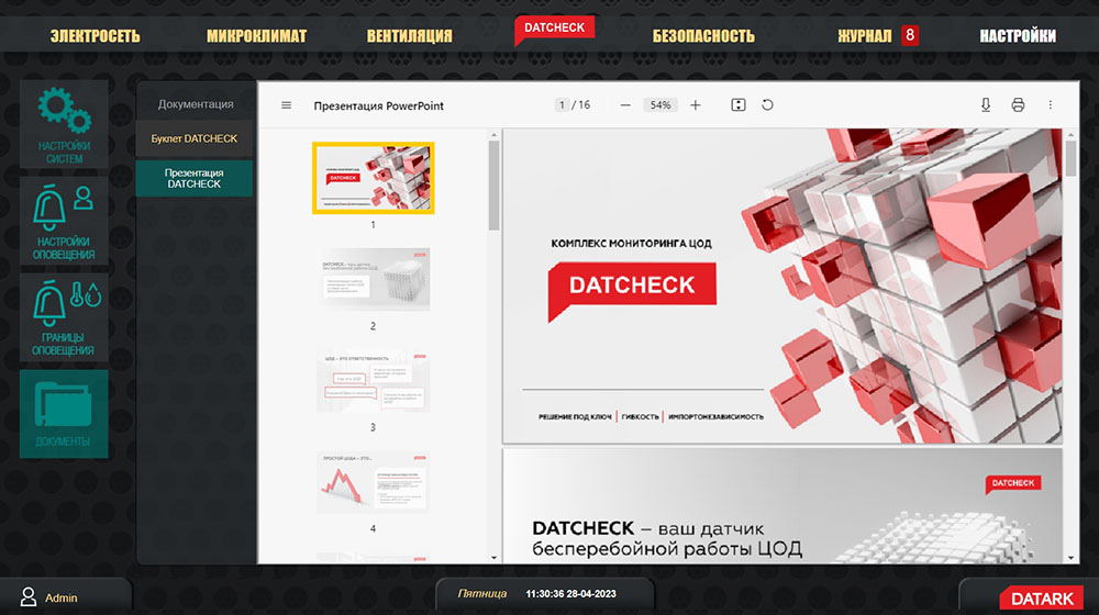 Для пользователей будет особенно полезна и интересна возможность хранения в системе DATCHECK полного актуального комплекта эксплуатационной документации (например, при проведении ремонтов и замен). Любая схема, кабельный журнал или инструкция будут в несколько кликов доступны ответственному специалисту.