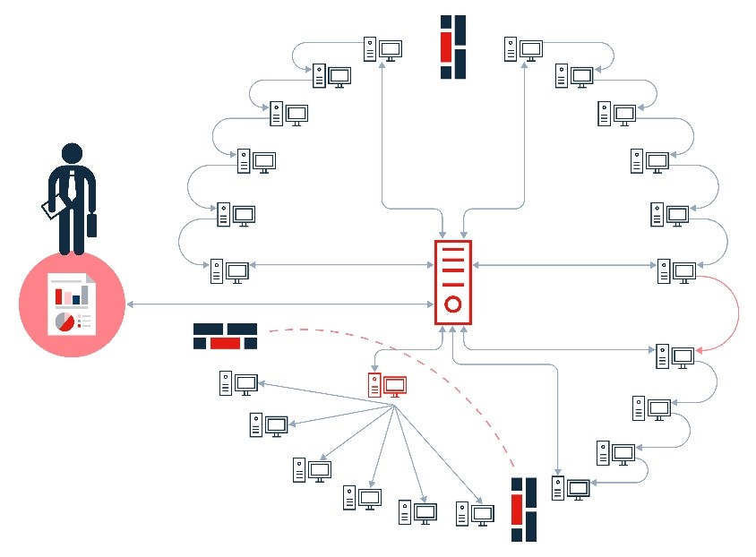 Поэтому ИТ-специалистам компании нужно решение, которое выстраивает цепочку из связанных узлов передачи данных. Причем узел будет и приемником, и передатчиком, т.е. собирать и передавать инвентарные данные. В таком случае нет необходимости выстраивать внешнюю архитектуру для этих узлов.