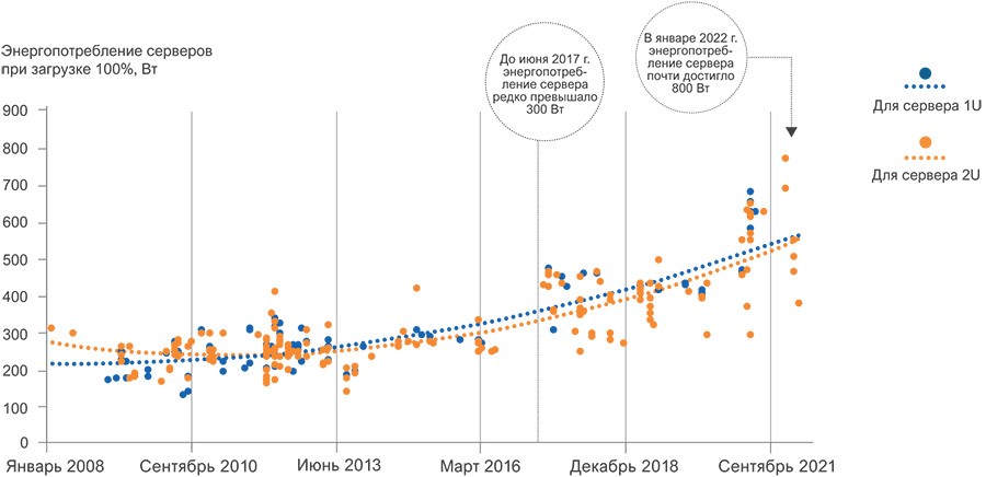 Эта тенденция скоро начнет влиять на нынешние подходы к проектированию ЦОДов. Более «горячие» процессоры уже появились. Новая серия серверных процессоров Intel имеет расчетную тепловую мощность (TDP) 350 Вт и возможность дополнительной настройки до более чем 400 Вт (по сравнению с 120–150 Вт всего 10 лет назад). Через несколько лет предполагается выпустить процессоры с TDP 500–600 Вт. В результате энергопотребление базовых серверов приблизится к 1 кВт или более, что повысит требования как к электропитанию, так и к управлению температурой.