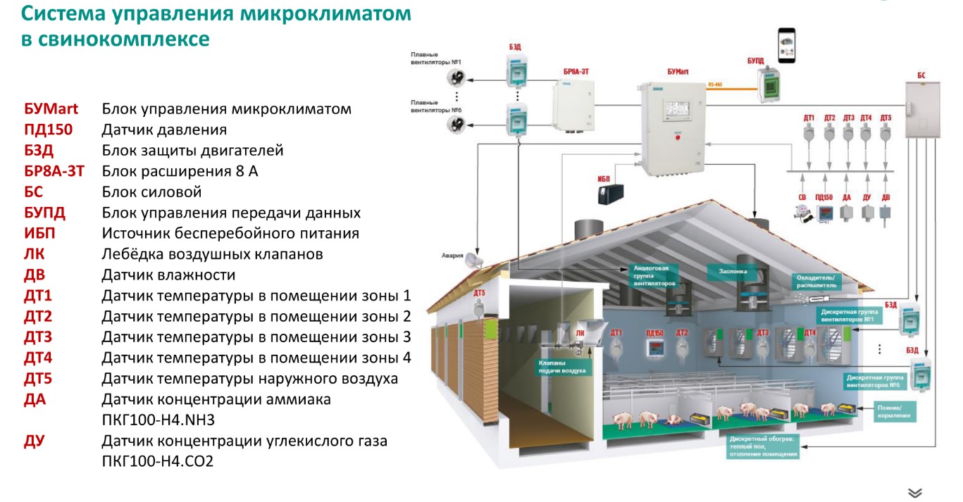 Конечно, на ферме не обязательно дублировать инженерные системы, не так критичны кратковременные перебои с электричеством, но так же используются ИБП, системы мониторинга, кондиционеры и СКУД. Операторы отслеживают показания датчиков температуры, давления и влажности. Есть и своя специфика – животные выделяют газы, в результате разложения мочи и кала в свинарниках накапливается вредный аммиак, а в ЦОДах датчики концентрации углекислого газа и аммиака не нужны.