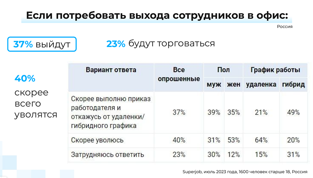 Компании и сотрудники оценили преимущества удаленной работы и не спешат с ними расстаться. Опрос менеджеров крупных западных компаний, проведенный Infosys, показал, что 59% менеджеров работают в гибридном или удаленном формате. Перевел сотрудников на гибридный формат работы «Яндекс». По данным портала SuperJob, если потребовать выхода сотрудников в офис, то 40% скорее всего уволятся, а 23% – попросят прибавки к зарплате.