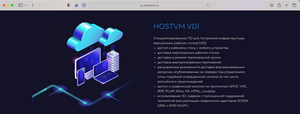 | HOSTVM VDI | ИК «Хост» | SPICE, VNC, RDP, PCoIP, X2Go, NX, HTML5, Loudplay |