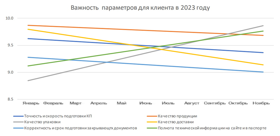 Если проводить подобные исследования регулярно, то можно проанализировать изменение клиентских запросов на длительном промежутке времени и заранее усилить тот или иной аспект сервисной поддержки. Например, наш анализ за 10 месяцев 2023 г. (см. рисунок) позволил нам проследить сезонные тенденции и учесть их в рабочих процессах. По нашему опыту, сезонность рынка проявляется ярко. Все крупные проекты бюджетируются в начале года, поэтому клиентам крайне важны точность и скорость подготовки КП и другой документации. А на осень приходится пик реализации проектов, идет поставка оборудования. В этот период критически важными становятся качество оборудования, сроки поставок, быстрота подготовки закрывающих документов.