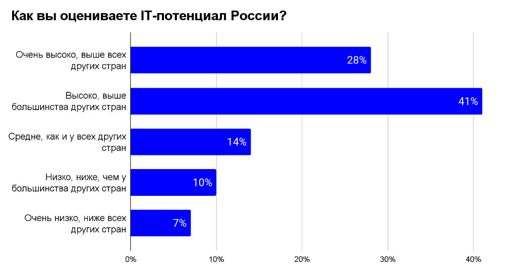 69% жителей страны считают, что российская IT-отрасль имеет мощный потенциал для роста и развития. В частности, 28% уверены, что он выше, чем абсолютно у всех остальных стран, еще 41% дают чуть более спокойную оценку и полагают, что IT-потенциал России сильнее, чем у большинства других государств.