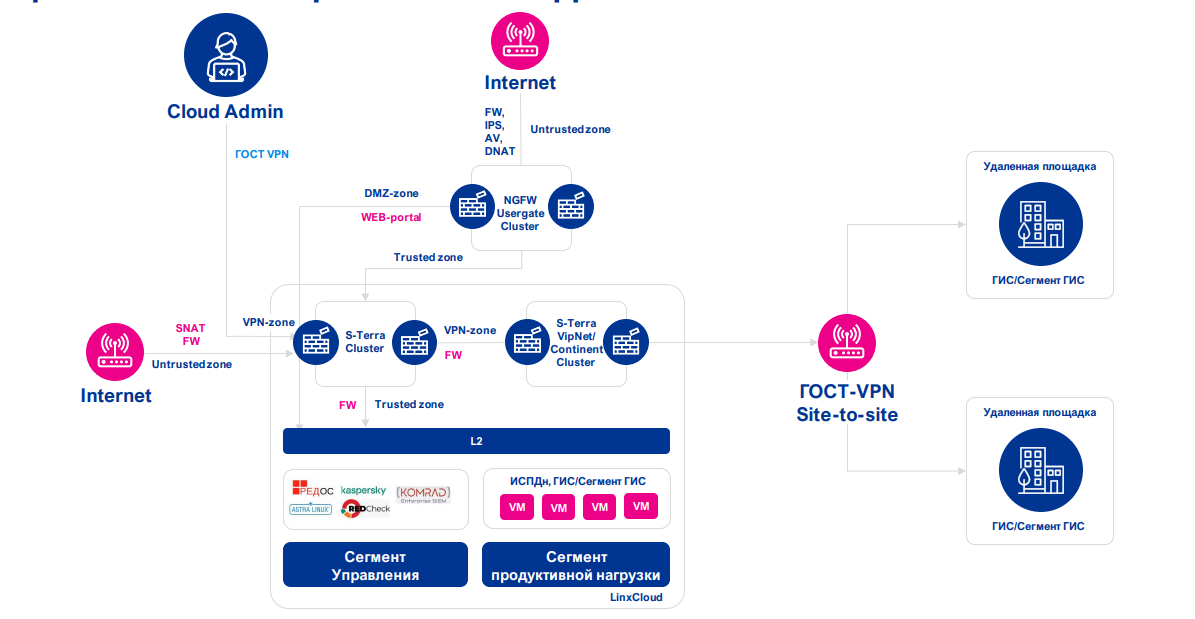 На этой схеме стоит отметить сегмент управления облаком, за который отвечает облачный провайдер, и сегмент продуктивной нагрузки, в котором размещается продуктивная система клиента. Вся архитектура защищена межсетевым экраном нового поколения, а доступ к административным функциям осуществляется только через VPN.