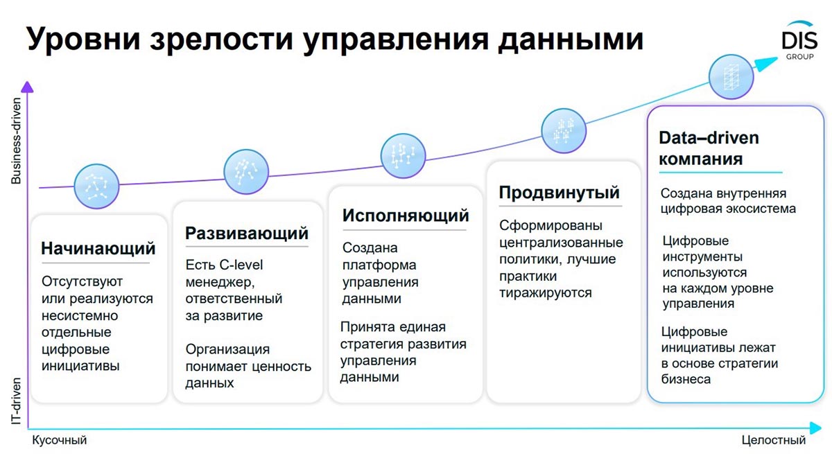 Готов ли российский бизнес к переходу на «экономику данных»? Обсуждение показало, что прогресс есть. Согласно представленному на дата-саммите исследованию DIS Group «Оценка зрелости управления данными», в период с 2018 по 2023 гг. доля компаний, которые находятся в процессе реализации инициатив по управлению данными, выросла с 17 до 89%.