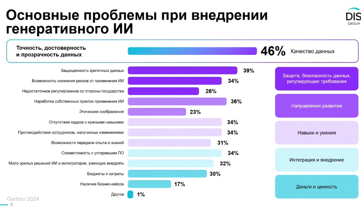 Среди ключевых тем мероприятия – подготовка данных для эффективной работы с искусственным интеллектом и обсуждение концепции национального проекта «Экономика данных». Перспективы нацпроекта, как можно было заключить из рассказа открывшего саммит генерального директора DIS Group Павла Лихницкого, весьма радужные. Инвестиции в него до 2027 г. достигнут 1,6 трлн руб., а ожидаемый вклад в ВВП страны составит 11,2 трлн руб. П. Лихницкий привел также данные опроса Gartner, согласно которым к основным проблемам генеративного ИИ относятся качество данных (указали 46% опрошенных) и вопросы безопасности (39%).
