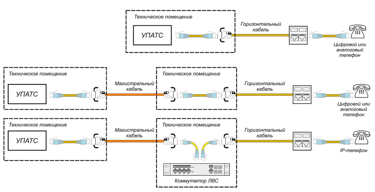 ЛВС и телефонная сеть используют технологии передачи данных, которые в общем случае несовместимы ни по аппаратуре, ни по форматам линейных сигналов. В первом случае задействована волоконно-оптическая техника, а во втором – симметричные кабели категории не выше 5е. Плюс к этому телефонная сеть должна поддерживать работу ранее выпущенных учрежденческо-производственных АТС (УПАТС). Поэтому в СКС первых поколений магистральные подсистемы делились на две основные части. При этом «телефонная» составляющая была жестко специализированной, а волоконно-оптическая использовалась другими сетями из-за их построения на основе технологии Ethernet.