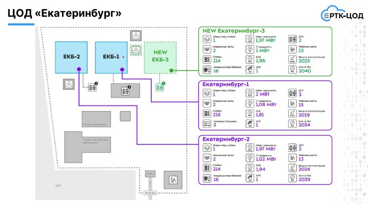 Как и предыдущие коммерческие дата-центры «РТК-ЦОД», третья очередь ЦОДа «Екатеринбург» будет соответствовать уровню отказоустойчивости Tier III Uptime Institute. Проектное количество стоек нового ЦОДа — 214, суммарная мощность — 2 МВт.