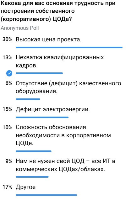 Интерес участников конференции к строительству корпоративных ЦОДов оказался настолько велик, что на секции «Технологии и решения для ЦОДов» был аншлаг — организаторам пришлось приносить дополнительные стулья. Согласно проведенному в телеграм-канале «ИКС» опросу, в тройку основных трудностей при построении собственного ЦОДа входит нехватка квалифицированных кадров. Один из способов решения проблемы — использование изготовленных в заводских условиях prefab-модулей или даже полностью готовых prefab-ЦОДов.