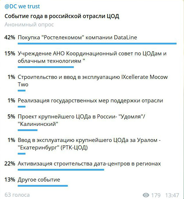 Таковы результаты опроса, проведенного телеграм-каналом @DC we trust среди топ-менеджмента крупнейших отечественных центров обработки данных. В тройку самых значимых событий входят также активизация строительства дата-центров в регионах и учреждение АНО "Координационный совет по ЦОДам и облачным технологиям".