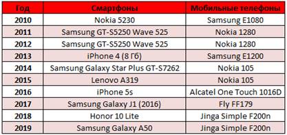 За последнее десятилетие россияне приобрела около 400 млн мобильных средств связи на сумму почти 3 триллиона рублей. Но если в 2010 году только 10% пользователей выбирали «умные» устройства, то в 2019 году на каждые три приобретённых смартфона пришёлся только один мобильный телефон.